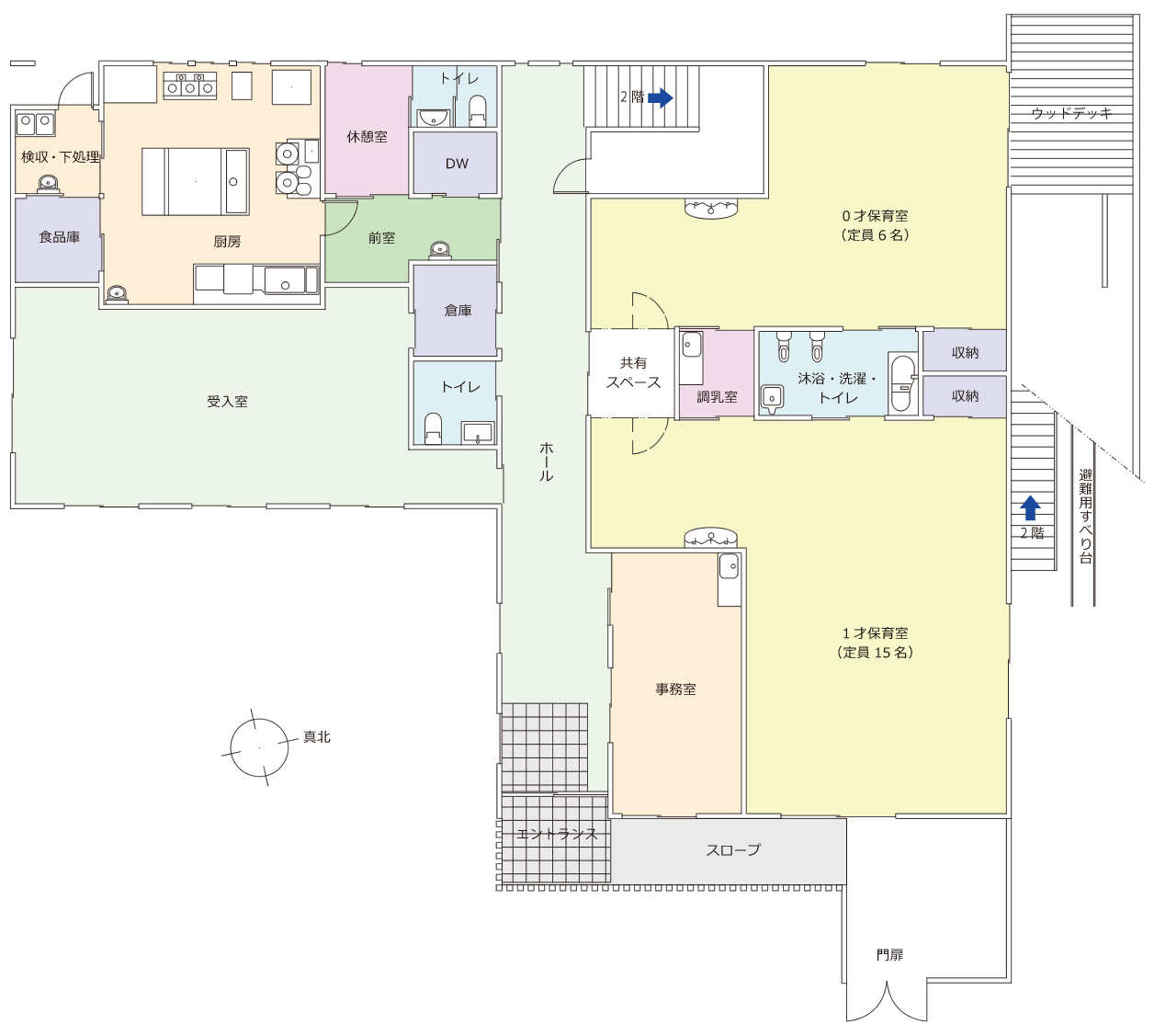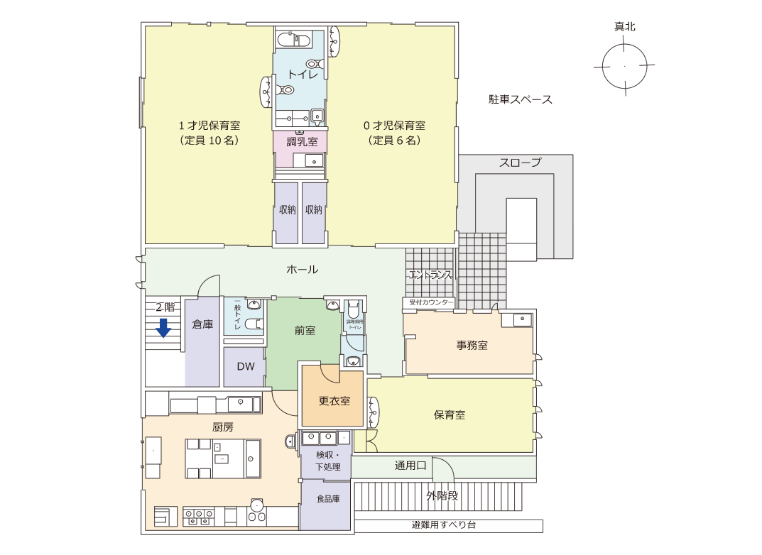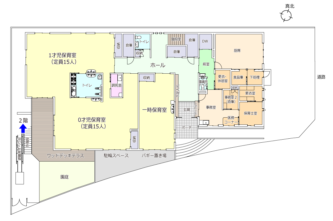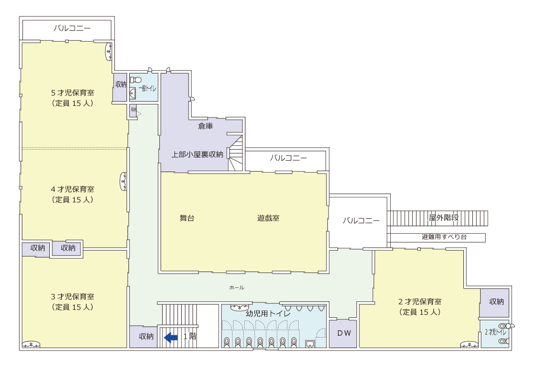 | 開園日 | 開園時間 | 一時保育 | 定員 | 園庭 | テラス | 屋上テラス | |